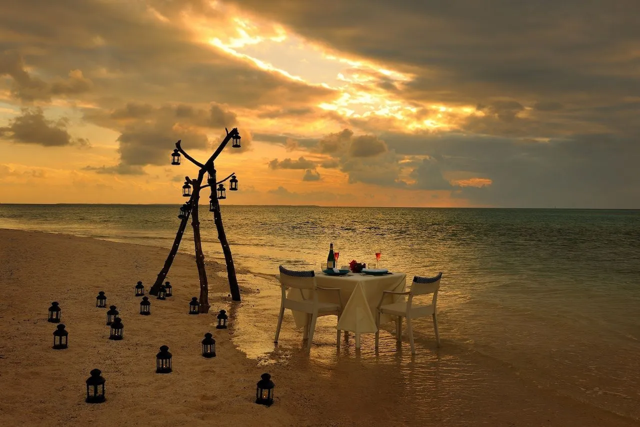ビーチに設える二人のためだけの席と星や海をテーマにしたコース料理