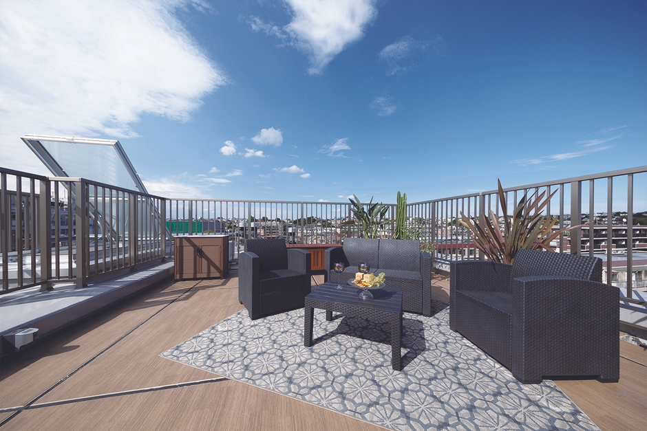最上階の屋上には、アウトドアリビングとして使える、広々とした開放感溢れるパノラマテラスを用意。天気の良い条件が揃った日には、富士山も望めます。