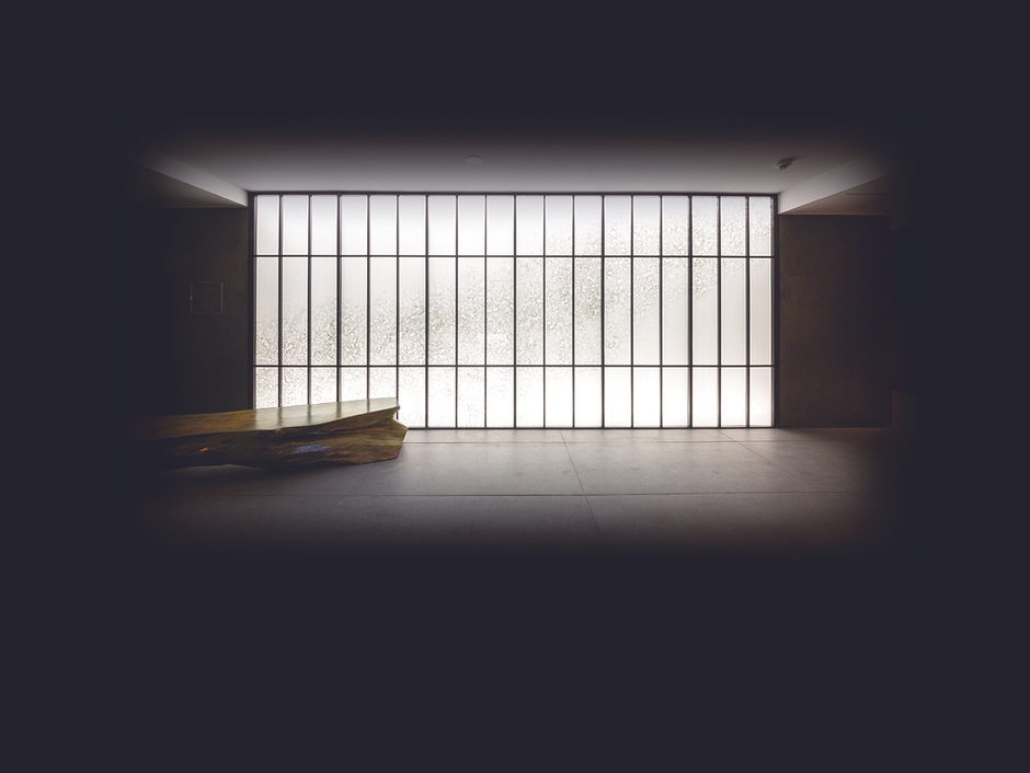 原木を使った一品物の木製ベンチと、入って正面に広がる光壁が印象的なエントランスホール。光壁には川をイメージした文様を浮かべ、和を感じさせる意匠で落ち着きと高級感を演出しています。