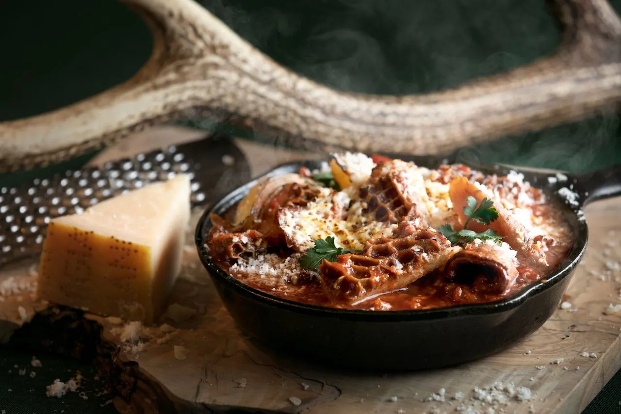 狩猟体験の前日もしくは当日の夜は、星のや富士で提供する「秋の狩猟肉ディナー」も併せて食べることができます(別料金)。このディナーは、星のや富士の屋外レストラン「フォレストキッチン」で開催され、グランピングマスターの手ほどきを受けながらダッチオーブンを使ってお客様自身がコース料理を仕上げるものです。「狩猟肉ディナー」は通年開催しておりますが、秋のコースでは、滝口氏のように山で生きる猟師たちのライフスタイルをコンセプトにして、調理法や食材を選定しました。猟で冷えた体を温めるスープ、猟師にしか手に入れることのできない鹿の希少部位を使用したモツ煮、猪ときのこを豪快に合わせたすきやきなど、狩猟肉の美味しさに、ワイルドさと秋の味覚が加わった全6品のコース料理です。
