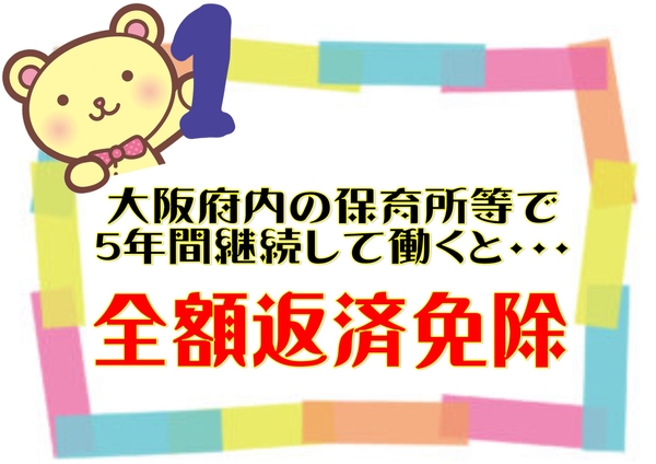大阪府内の保育所などの施設で保育士として継続して5年間働くと借りたお金は「全額返済免除」になる制度です。