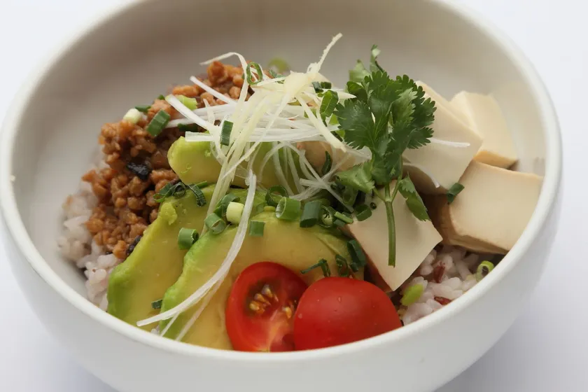大豆ミートの肉燥(台湾肉みそ)と豆腐チーズやアボカドをトッピングしたボリューム満点なのにヘルシー