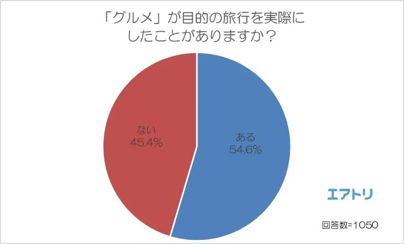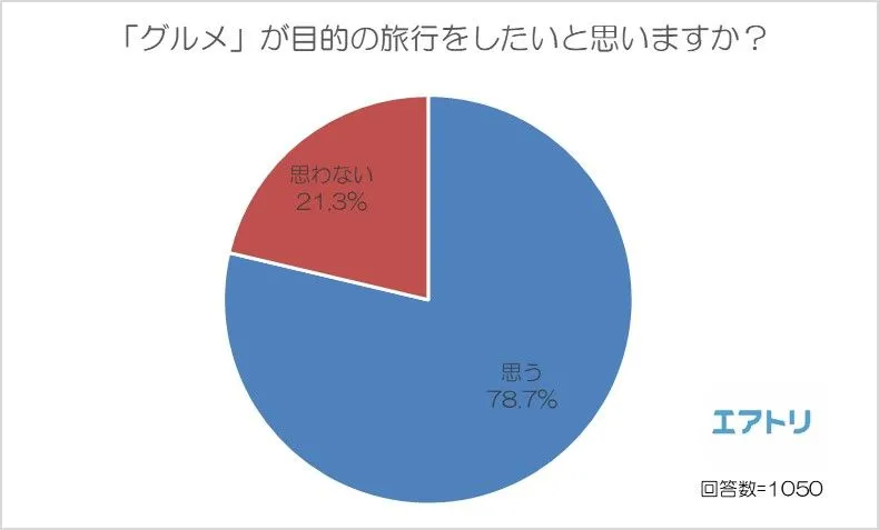 オンライン総合旅行サービス「エアトリ」(http://www.skygate.co.jp)を運営する株式会社エアトリ(本社:東京都新宿区、代表取締役社長:吉村 英毅)は、10代~70代の男女1050名を対象に「グルメ旅行」に関する調査を実施しました。