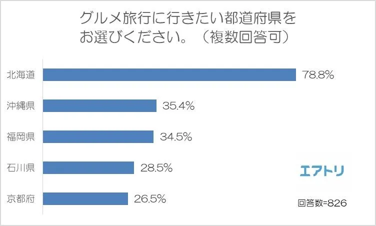 旅行時に重視する要素、 76%の人が重視している「グルメ」が1位に! 人気グルメ旅行先の国内No.1は「北海道」、 海外No.1は「台湾」 海外グルメは日本のグルメより安さを重視する傾向に! ~エアトリが「グルメ旅行」に関する調査を実施~