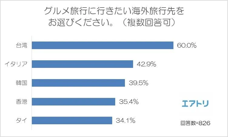 グルメ旅行に行きたい海外旅行先を聞いた結果、ベスト3は「台湾」(60.0%)、「イタリア」(42.9%)、「韓国」(39.5%)となりました。台湾で食べたい物は小籠包、イタリアではパスタ、韓国では焼肉などを食べたいという意見が挙がりました。