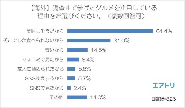 海外グルメに関しては、1位と2位は「美味しそうだから」(61.4%)、「そこでしか食べられないから」(31.0%)と国内と同じでしたが、海外では理由の3位として「安いから」(14.5%)が入りました。飛行機代や宿泊費など国内よりも他のお金がかかることが多いからか、海外でのグルメは安さを重視する人が多いようです。