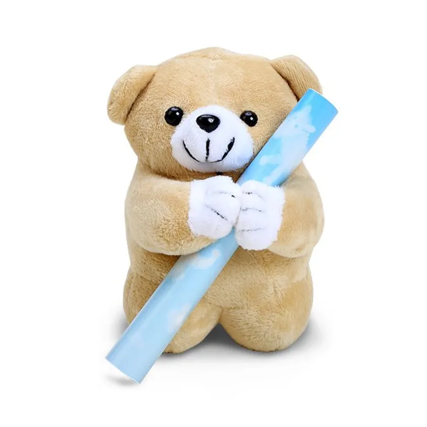 メッセージベアーは電報メッセージを入れたベーシック台紙と一緒にお届けするクマのぬいぐるみです。故人様が寂しくならないように棺の中へ入れていただいたり、お仏壇へお供えすると故人様のためにお祈りをしてくれます。空をイメージした筒状のカードは裏面にメッセージベアーの説明が記載されており、カードの代わりにお花や思い出の品を持たせることもできます。