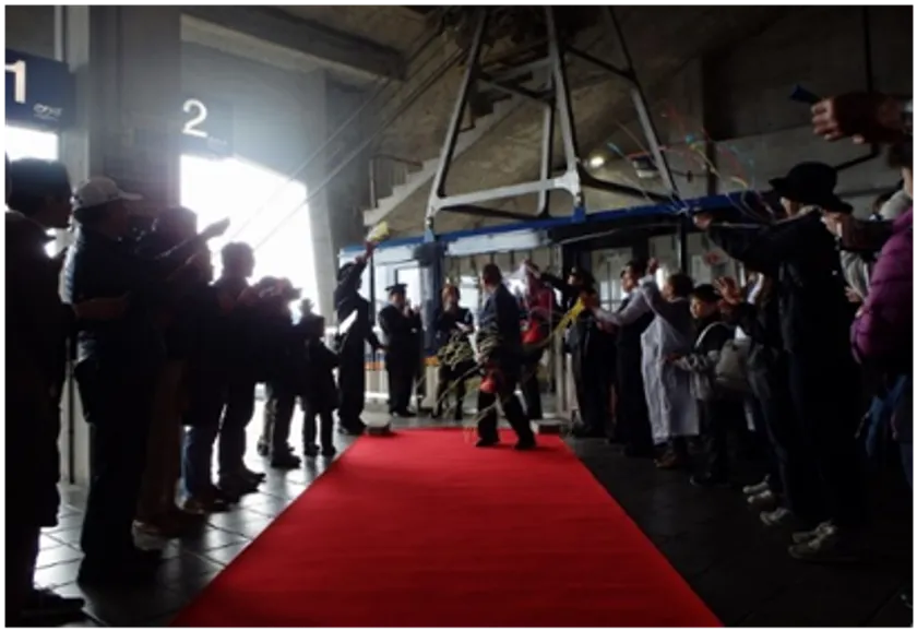 (3)告白が成功すれば、大観峰駅スタッフとお客様がホームでお出迎えし祝福を行う。