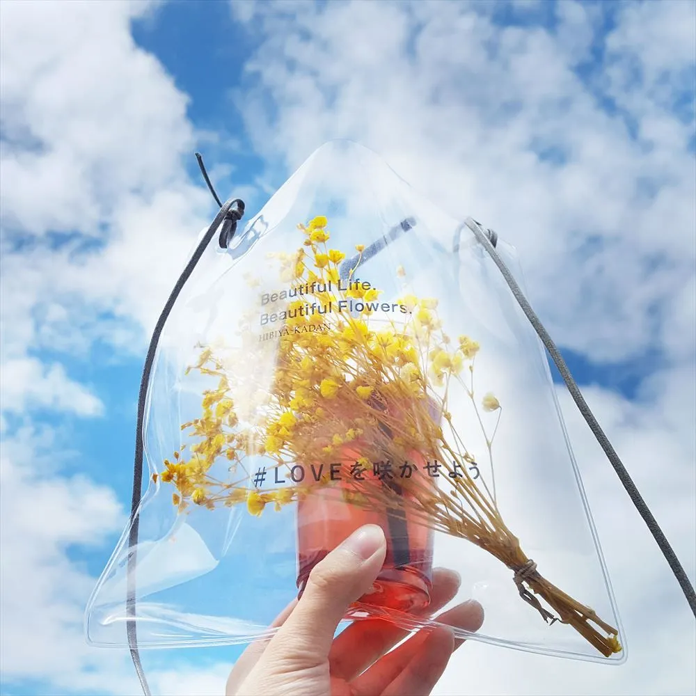 テーマフラワーの「カスミソウ」の入ったクリアサコッシュにドリンクを入れて肩にさげながら持ち運ぶことができます。