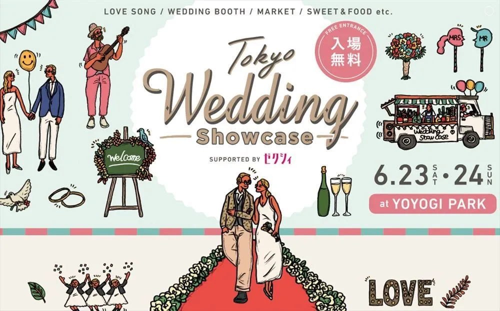 「Tokyo Wedding Showcase」は、“ウエディング”をテーマに、LIVEやトークショー・ドレスショーが観れる野外ステージを始め、おしゃれなスイーツやフード・ドリンク、グリーンやアクセサリーが充実したショップを楽しめるマーケットなど、カップルで楽しめる多彩なワークショップ、ウエディング会場やギフトの相談ができるブースなどが並ぶ、まるで何処かのウエディング会場に来たようなウエディングフェスティバルです。