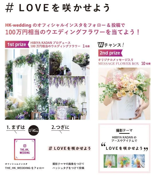 ◆内容:日比谷花壇ウエディングの公式Instagram「@the_hk_wedding」をフォローの上、ハッシュタグ「#LOVEを咲かせよう」のハッシュタグをつけて、当社のブースや、マイリム、フラワーサコッシュなどのアイテムの写真をアップしてください。