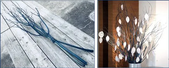 ミツマタは中四国で紙幣用に栽培されているジンチョウゲ科の落葉低木で、枝の先がその名のとおり3つ又に分かれています。花材としても利用されるミツマタを、徳島の伝統産業である藍染で仕上げております。
