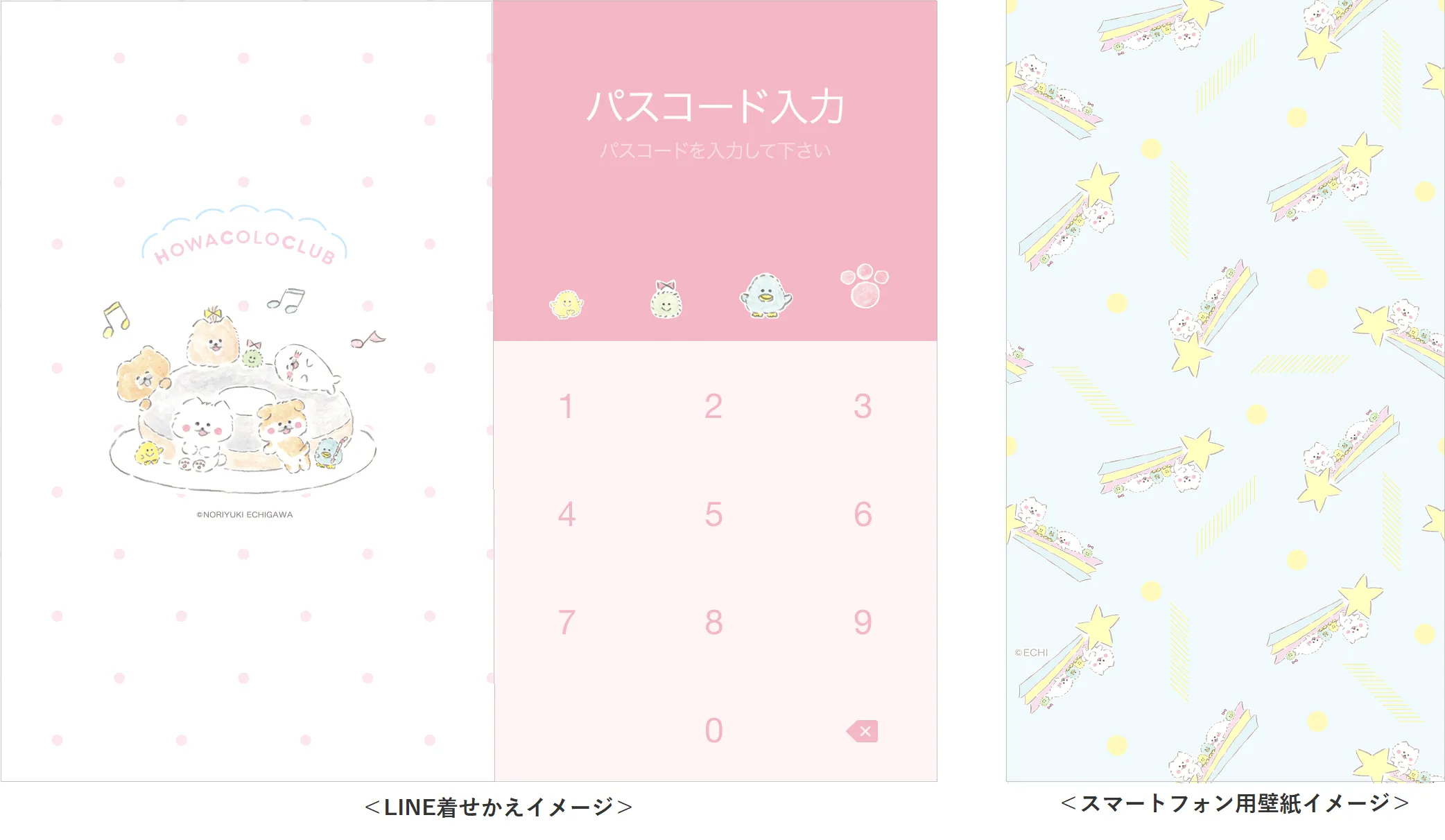 さらにぬいぐるみやアパレルなど、続々と関連商品が発売される中、ついにファン待望のLINE着せかえをリリース!「ほわころくらぶ」の世界観を表現した優しい色味と、見ているだけで癒されるほわころちゃんたちの表情が可愛らしいデザインです。そのほか、ネオスが提供する着せかえプラットフォーム【カスタモ】にてスマホ用壁紙の配信を開始しているほか、「ドコモメールストア」におけるスマホ用スタンプの配信など、今後も『ほわころくらぶ』の魅力が詰まったさまざまなデジタルコンテンツを随時提供してまいります。
