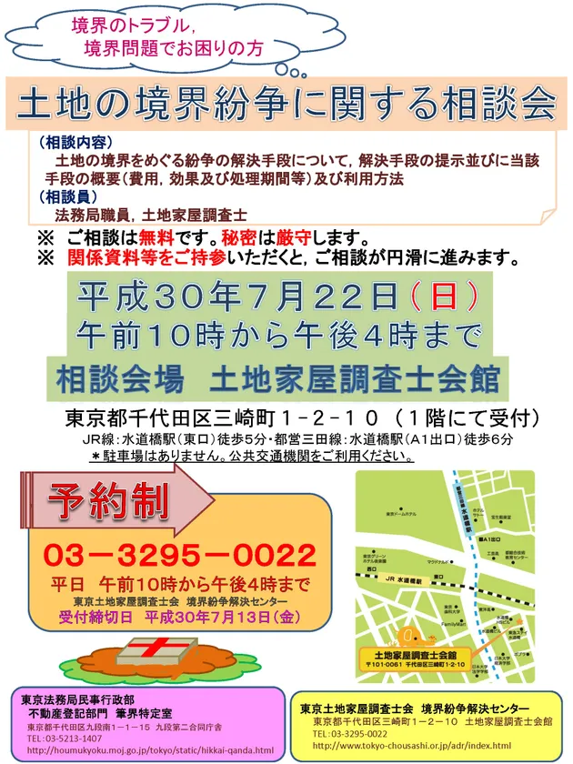 東京土地家屋調査士会 境界紛争解決センター(センター長:内野 篤、所在地:東京都千代田区)は、2018年7月22日(日)に、東京法務局と東京土地家屋調査士会 境界紛争解決センターの合同による無料相談会(事前予約制)を、東京土地家屋調査士会(東京都千代田区神田三崎町1-2-10 土地家屋調査士会館)で実施いたします。