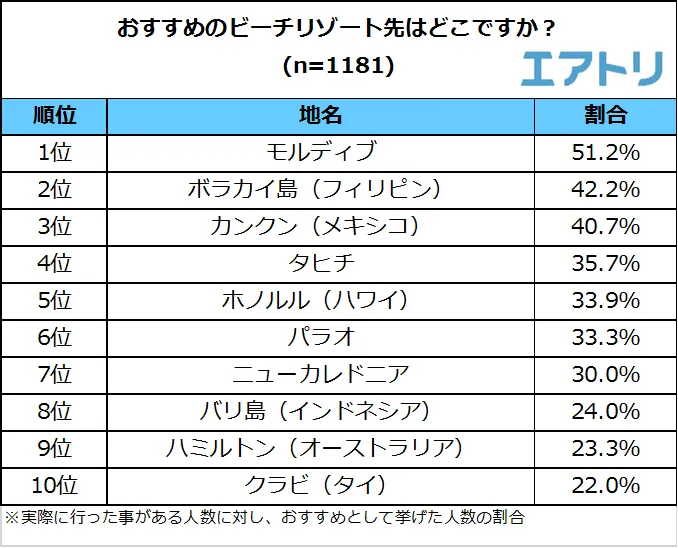 1位は「モルディブ」(51.2%)で、2位の「ボラカイ島(フィリピン)」(42.2%)に9.0ポイントもの大差をつける結果となりました。3位は「カンクン(メキシコ)」(40.7%)でした。