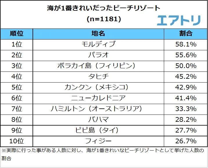 ビーチリゾートへ旅行したことがある人に、海が1番きれいだったリゾート地を聞いたところ、またしても「モルディブ」(58.1%)が1位となり、「おすすめのビーチリゾート先」で2位に選ばれた「ボラカイ島(フィリピン)」(50.0%)は3位にランクインしました。2位は「パラオ」(55.6%)でした。