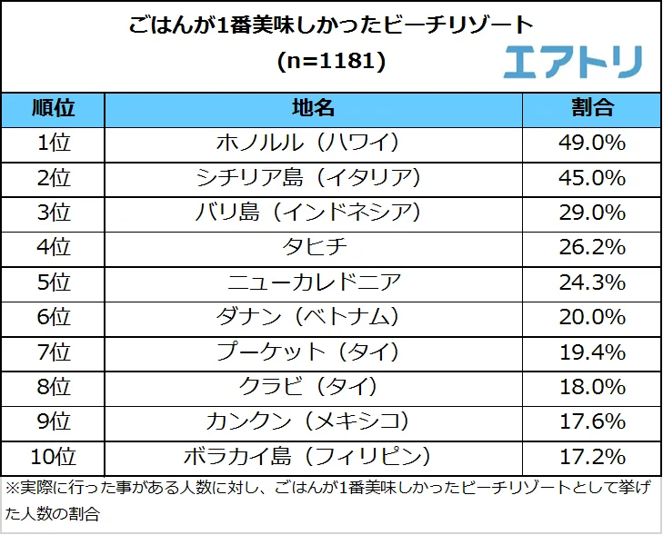 ビーチリゾートへ旅行したことがある人に、ごはんが1番おいしかったビーチリゾートを聞いたところ、ビーチリゾートの定番である「ホノルル(ハワイ)」(49.0%)が1位となりました。2位は「シチリア島(イタリア)」(45.0%)で、3位は「バリ島(インドネシア)」(29.0%)がランクインし、「おすすめのビーチリゾート先」や「海が1番きれいだったビーチリゾート」とは違い比較的日本からの旅行者も多く馴染みのあるリゾート地がランクインしました。