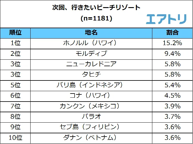 「ホノルル(ハワイ)」(15.2%)が4回目の1位に選ばれ、多くの人に愛されていることが分かりました。また、「モルディブ」(9.4%)が2位、「ニューカレドニア」「タヒチ」(5.8%)が同率3位となり、遠方のビーチリゾートがランクインする結果となりました。