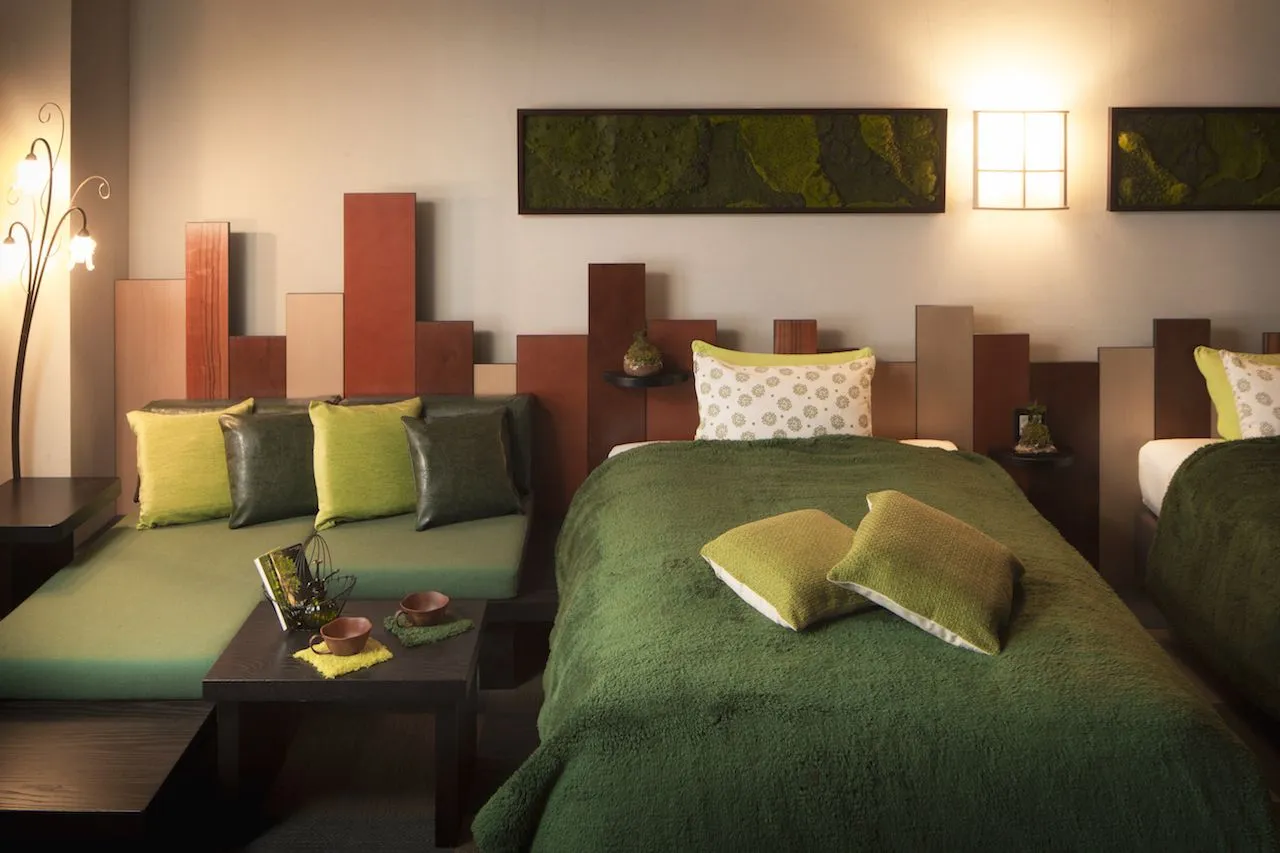 苔をテーマにした1室限定の客室を用意しています。インテリアには、苔の質感を表現するため、様々な生地を使用しています。客室の随所で苔を愛でることができ、苔散策グッズも充実しています。
