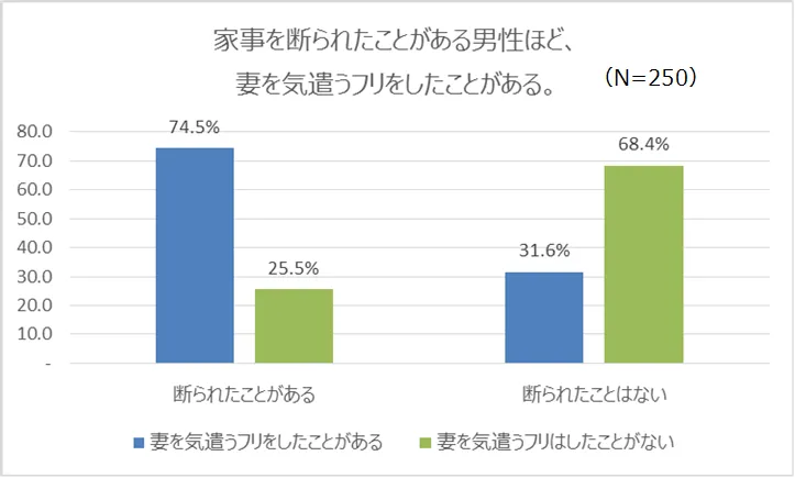 さらに深掘りすると、「家事を断られたことがある夫ほど、妻を気遣うフリをしたことがある」という傾向が明らかになっています。