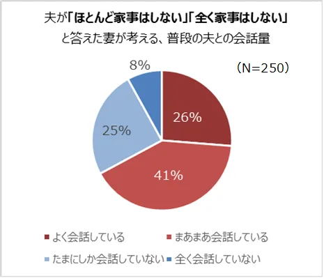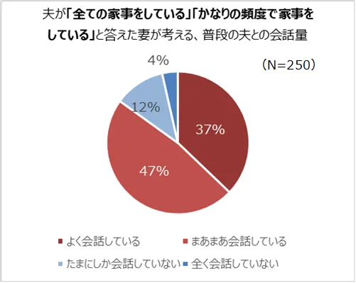今回実施した「夫婦の家事に関する調査」では、「夫が家事を積極的にする夫婦ほど、会話が多い」傾向が明らかになりました(下記グラフ参照)。逆に言うと、「妻の家事負担が大きい夫婦ほど、会話が少ない」傾向にあると言えます。