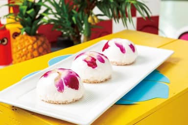 ヒルトンが作ったカクテルとして知られる「ピニャコラーダ」を、まあるいデザートにアレンジ。クッキー生地を丸くかたどって焼いたショートブレッドの上に、ドーム型のココナッツムースをのせました。ムースは割った瞬間、中からパイナップルジュースがとろっと溢れだし、南国の香りを楽しめます。エディブルフラワーの鮮やかな赤紫色が真っ白なムースに映えます。