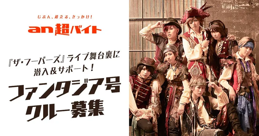 総合人材サービス、パーソルグループのパーソルキャリア株式会社(旧社名:インテリジェンス、本社:東京都千代田区、代表取締役社長:峯尾 太郎)が運営するアルバイト求人情報サービス「an」< https://weban.jp/ >と、全員ショートカットの7人組ボーイッシュ・ガールズ・グループ『ザ・フーパーズ』は、思わず挑戦してみたくなるような「an超バイト」の新企画として、7月14日に開催される『TOUR FANTASIA 2018 -夢のトビラ-』の東京公演において、『ザ・フーパーズ』が率いる豪華客船「ファンタジア号」のクルーとして、ライブ舞台裏に潜入していただくバイトを2名募集します。