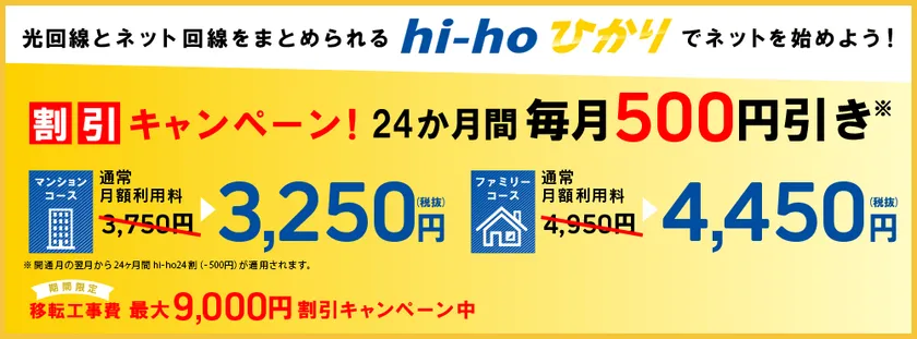株式会社ハイホー(本社:東京都千代田区、代表取締役:鈴木 武人、以下 ハイホー)は、2018年7月4日(水)より、光回線とプロバイダサービスのパッケージ「hi-hoひかり」を新料金で提供しております。さらに新規申し込みキャンペーンとして、24ヶ月間毎月の利用料が500円割引される「hi-ho24割」を実施いたします。