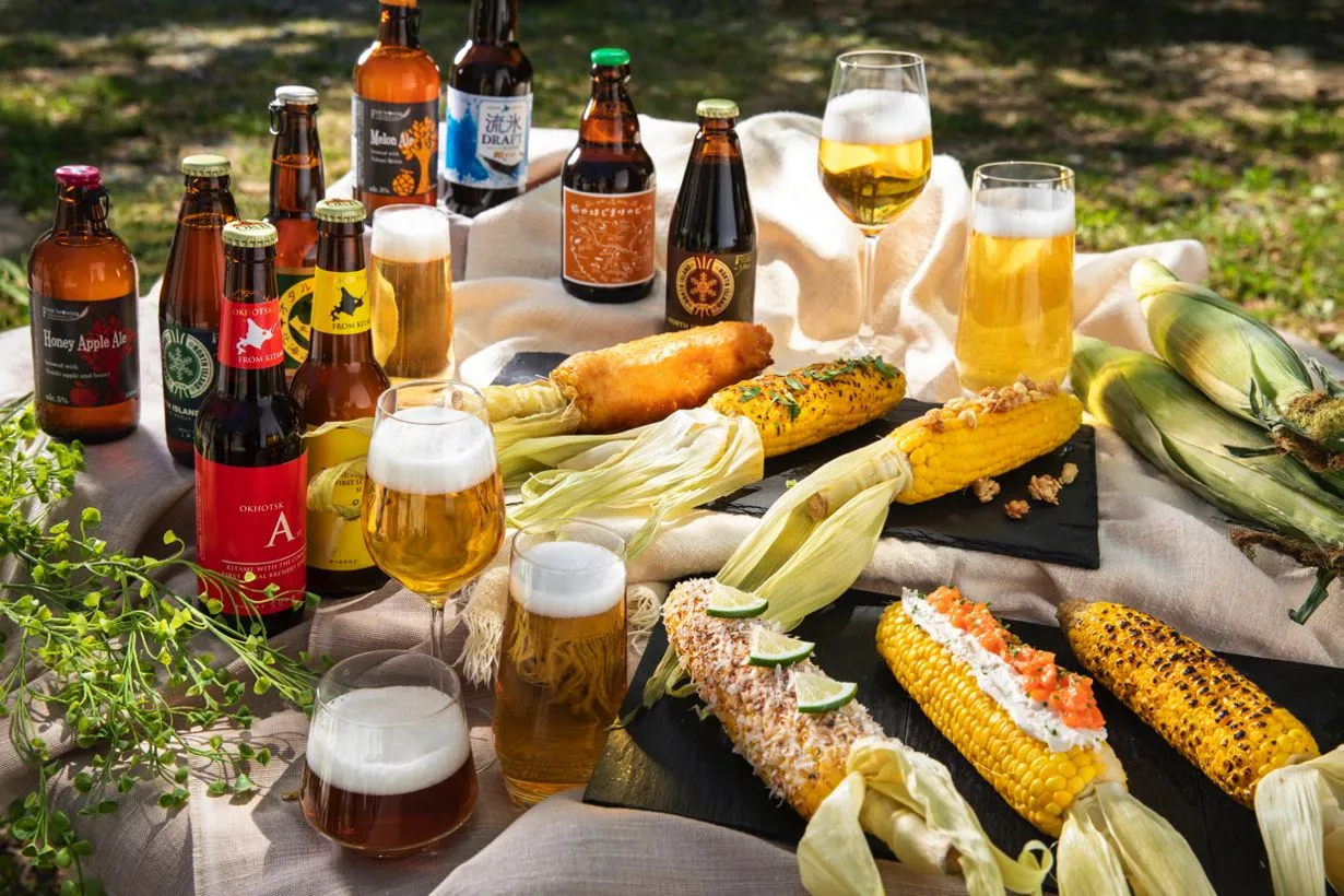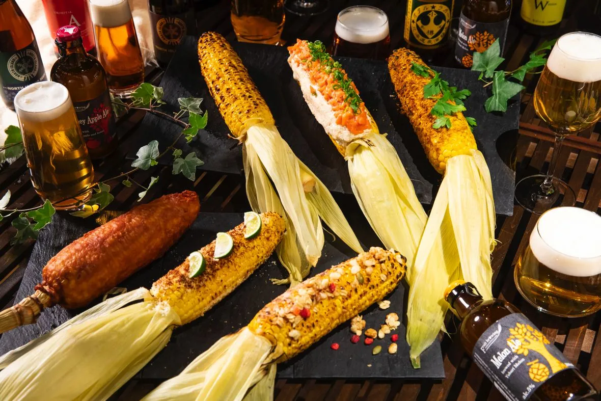 北海道のビールを中心にとうきびに合う10種のビールをセレクトしました。おすすめの組み合わせは、醤油バターとうきびと、「旅の始まりのビール」。ほんのりとした麦の甘みが喉の奥に残るような味わいが醤油バターの香ばしさと良く合います。