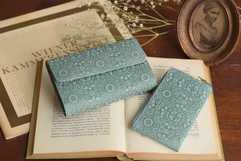 ウィリアム・モリスのデザインをレザーアイテムで復刻 ターコイズカラーで樹木や草木が絡み合う英国の伝統柄を表現!