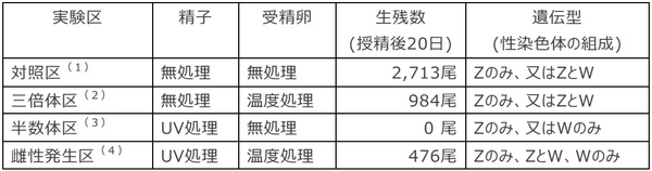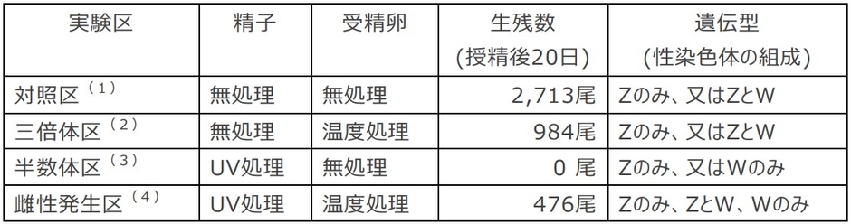 表1:実験区毎の処理条件及び授精20日後の生残数、並びに遺伝型