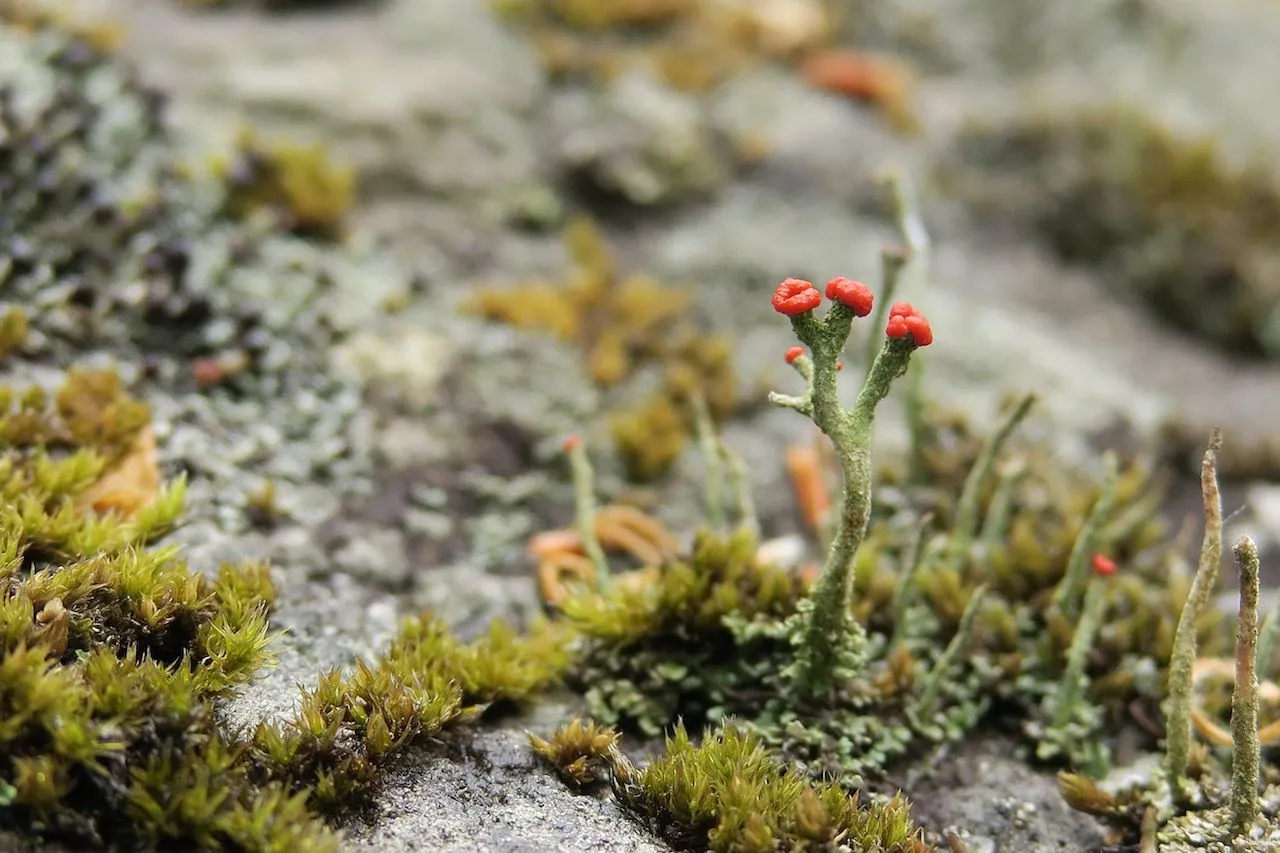 地衣類は、藻類(そうるい)(*1)と菌類(*2)の共生体です。岩だらけの環境でも最初に育つため、地衣類は「森のパイオニア」と呼ばれています。晩秋に入ると、木々の葉が落ち、森は少し寂しく見えますが、実は地衣類の小さな世界を観察する絶好なチャンスです。