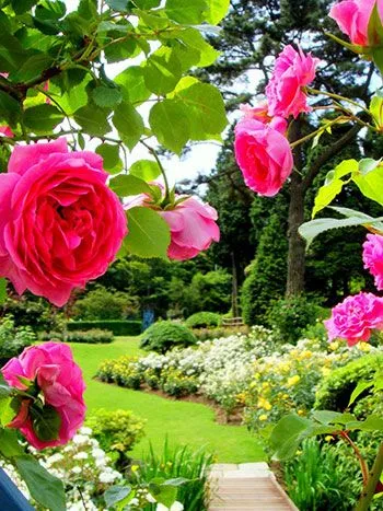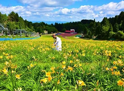 芝生が広がる開放的な園内には、自然を活かした遊び場がいっぱい。バラの小径ローズウオークでは約90種およそ2000本のバラが咲き誇ります。冬季、ゲレンデとして活用している斜面一面に咲き誇るニッコウキスゲもおすすめです。