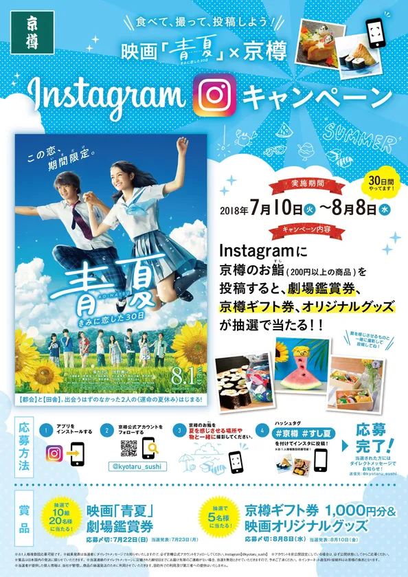 株式会社京樽(本社:東京都中央区、代表取締役社長:森下裕一)が運営する持ち帰り鮨店「京樽」では、映画「青夏」の8月1日(水)公開を記念したタイアップキャンペーンを実施いたします。