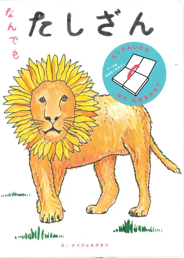 『なんでもたしざん』は、物とモノを足し算する新発想の絵本です。ヒマワリ+猫の足し算であれば、答えのライオンが下に広がる大きな画面で描かれています。自由に想像する楽しさや、ワクワクする気持ちをかき立てられるような、子どもの想像力をのばす絵本になっています。