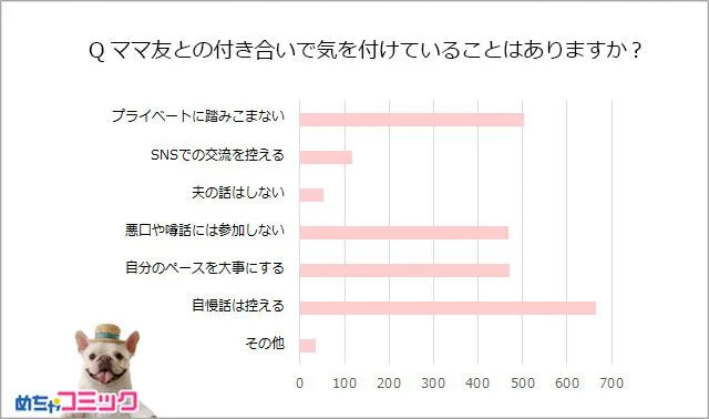 そこで、普段ママ友との付き合いで気を付けていることについて聞いてみると、「自慢話は控える」がトップという結果に。