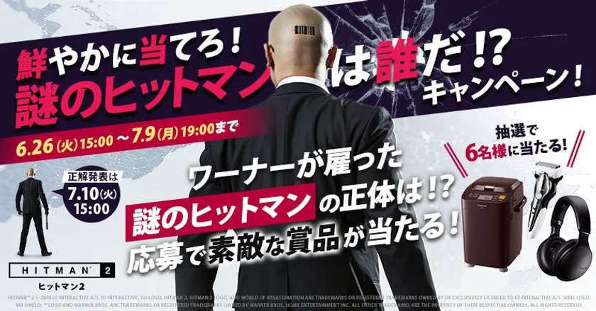 公式アカウントフォロー&キャンペーン告知ツイートを引用リツイートの上、あなたの予想するヒットマンの正体をコメントしてご応募ください。見事鮮やかに正解を射止めた方の中から抽選で6名様に、豪華賞品をプレゼントいたします。