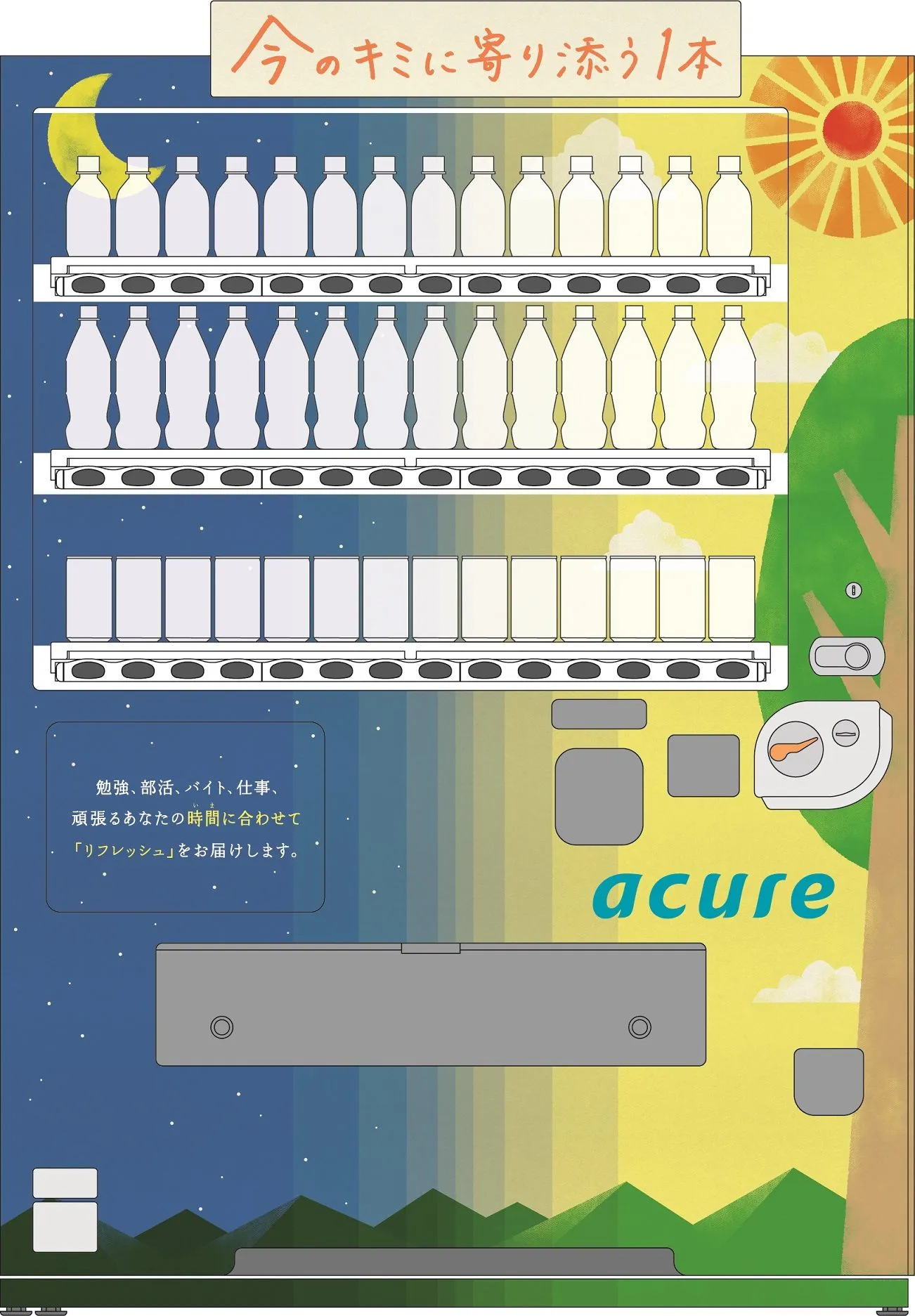 「大学生」といっても利用シーンは様々。勉強・部活・アルバイトなど様々なことを頑張る大学生の「今」に寄り添い商品を届けたいと思い、企画しました。朝から夜の一日を表現した斬新な自販機デザインが特徴です。