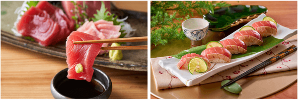 握り寿司は、とろける上質な脂が生とは異なる美味しさを楽しめる炙りと生の2種類を食べ比べでお楽しみください。