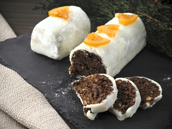 生地に自家製オレンジコンフィとチョコチップ、カカオニブ、アーモンドを合わせ、しっとりと焼き上げています。粉砂糖のうえにはドライオレンジで彩りをプラスしました。