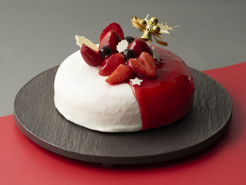 ピスタチオを混ぜ込んだ濃厚なベイクドチーズケーキに、苺とマスカルポーネのレアチーズケーキをのせ、真っ赤なグラサージュで仕上げました。苺とブルーベリー、ホワイトチョコをトッピングし特別感を演出しています。