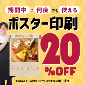 ACCEA EXPRESSよりポスターをご注文いただくと20%OFF、なんと何度でもご利用可能です。年末キャンペーンの販促物、イベントの告知ポスターなど様々なご用途にお使いください!クーポン番号はBizSPOTアプリ(https://spot.accea.co.jp/) でご確認ください。