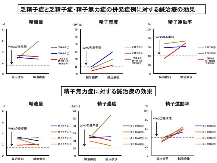 研究の結果、鍼治療を行うことで、精子数の増加と精子運動率の上昇が確認されました。実際に、乏精子症(精子の数が少ない状態)や精子無力症(精子の動きが悪い状態)、または両方が併発している症例においても自然妊娠が可能となる状態まで改善する例が認められています。※日本アンドロロジー学会第37回学術大会で発表