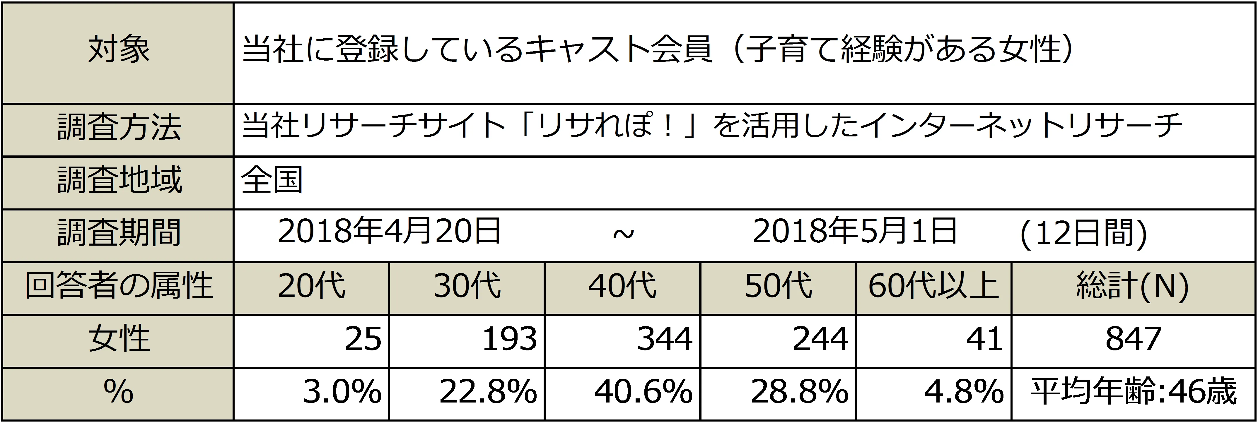 アンケートの対象は、当社に登録するキャスト会員で、有効回答数は847名(平均年齢46歳)のうち、出産後、お仕事に復帰をし、仕事をしながら子育てをした経験があると回答した154名を対象に実施しました。