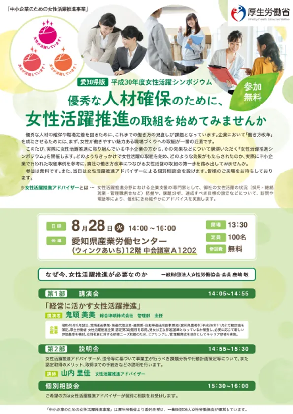 平成30年度「中小企業のための女性活躍推進事業」 (厚生労働省委託事業) 中小企業の成長のための『女性活躍推進シンポジウム』を開催
