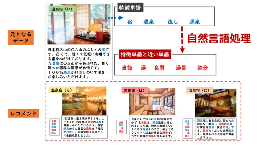 例えば、温泉宿のレコメンドを行う場合、商品マスタにあるタイトルや説明文から、「宿」「温泉」「流し」などの特徴的な単語を切り出します。そこでAIの自然言語処理により、前述の単語と類似性のある「当館」「湯」「良質」「湯量」などの単語を抽出します。説明文の文字が一致していなくても、単語間の距離が近い単語を多くもつ温泉宿を決定し、レコメンドします。