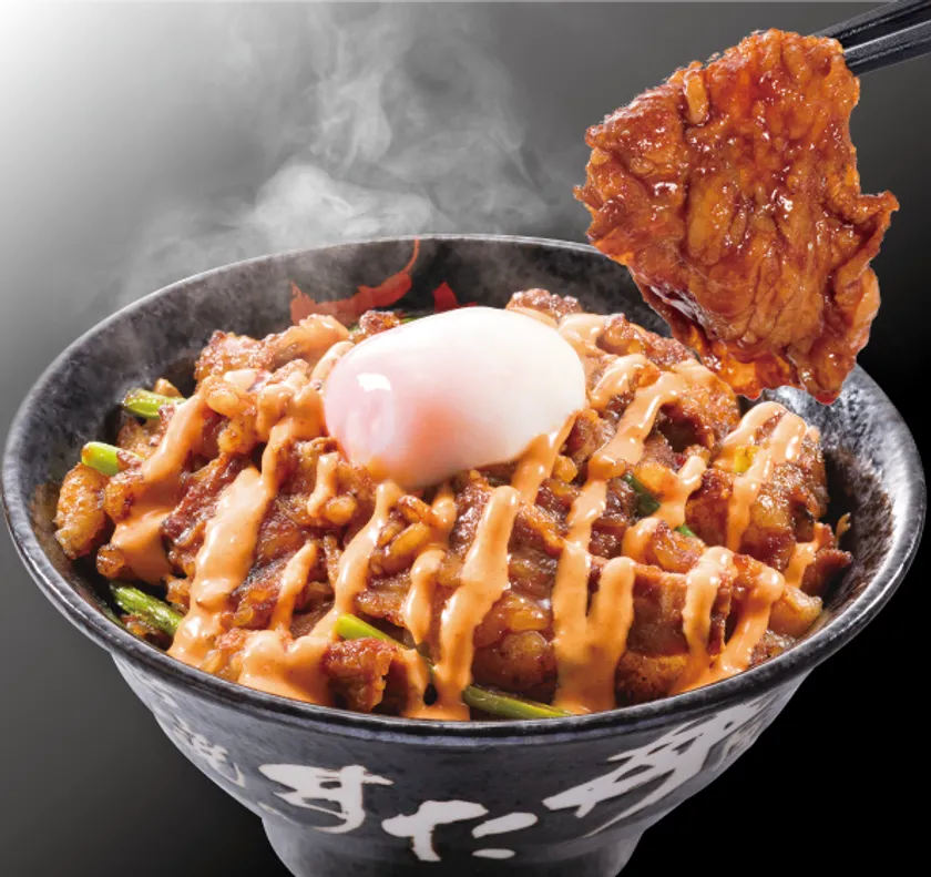 “特製すたみな焼肉ダレ”に漬け込んだ、白米に合う濃い味付けの牛バラ肉を、茶碗約3杯分のご飯の上にのせ、 “旨辛シラチャーマヨソース”をかけた「THE ジャンキー」な丼ぶりです。