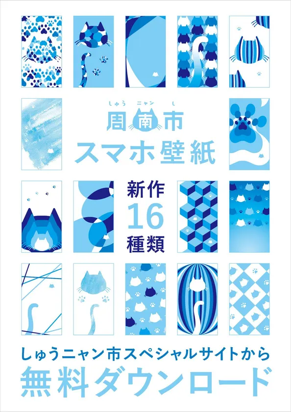 山口県周南市は2018年6月、しゅうニャン市のスペシャルサイトのしゅうニャン市スマホ壁紙ダウンロードコーナーに、とっても可愛くてアートなデザインの新作を16種類追加し、全30種類として配信を開始いたしました。しゅうニャン市のロゴやネコのシルエット、しっぽ、肉球がデザインされた壁紙をダウンロードしてお楽しみいただけます。
