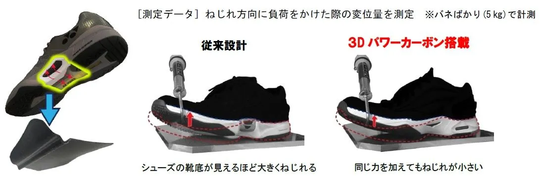弊社独自のカーボン加工技術を活かし立体に成型した「3Dパワーカーボン」をミッドソールの中足部に搭載。従来に比べ耐ねじれ性約20%※向上。軽いだけではなく、踏ん張り時に生じるねじれを防いでパワーロスを軽減し、俊敏なフットワークを可能に。