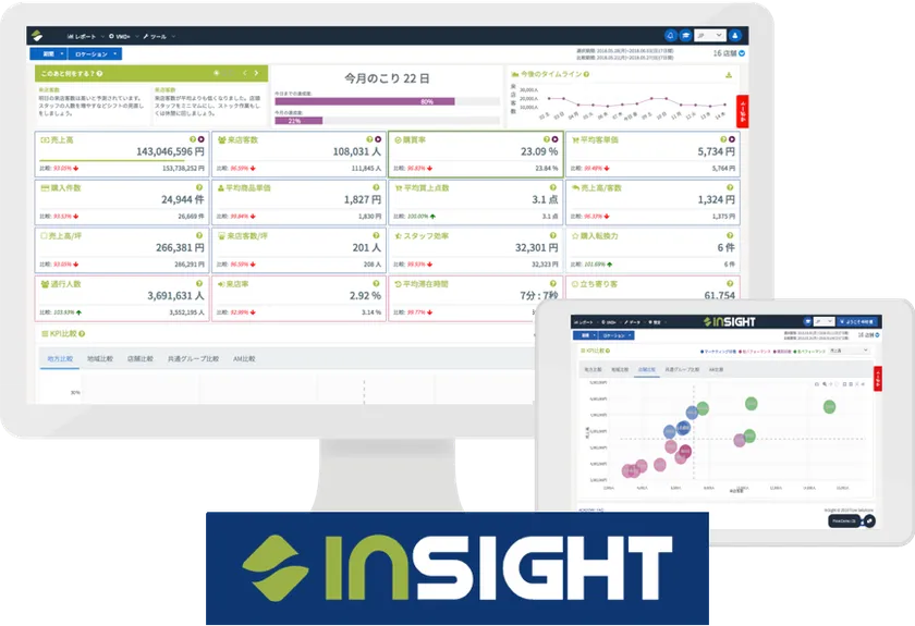 InSightはIoTセンサーを通じて取得した来店客数データをはじめ、POS・天気・スタッフなど店舗のあらゆるビッグデータを統合し、可視化するプラットフォームです。店舗と本部のコミュニケーションを活発化させるプラットフォームをコンセプトとし、店舗での使いやすさを第一に考え、開発されています。